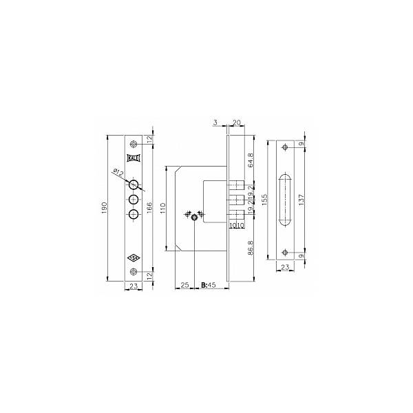 Класс безопасности 2. Удаление ключевого отверстия (бэксет / дорм) 45 мм. Ключ крестообразный. Трехригельный корпус; вылет ригеля 20 мм; диаметр ригелей 12 мм. Цвет лицевой планки латунь.