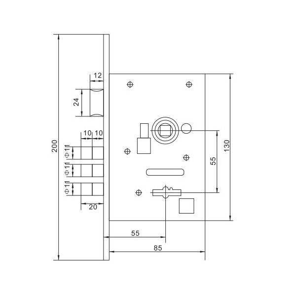 Сечение отверстия под квадрат фалевых ручек 8 х 8 мм.