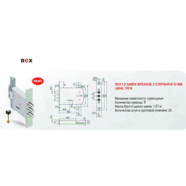 Замок врезной ReX 1.8 Эльбор шестисувальдный 2 класса секретности имеет 3 стержня, диаметр стержней 12мм с тягами, цинковое покрытие.