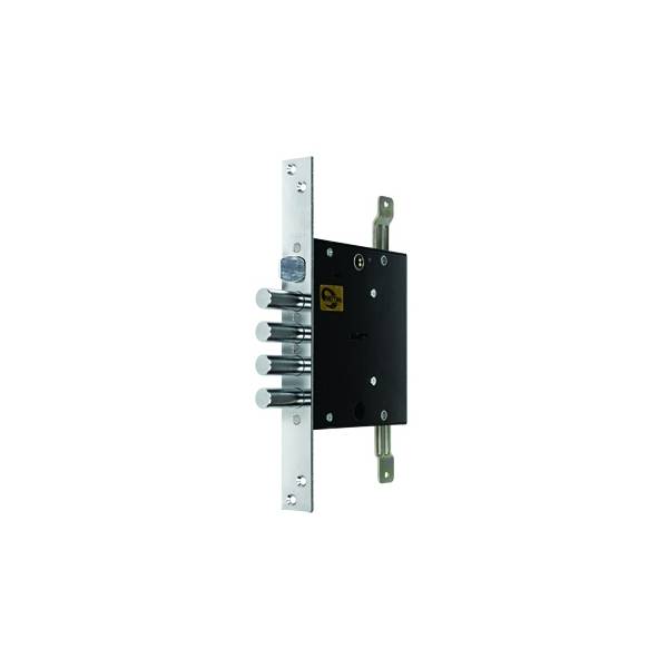 материал корпуса сталь, стальные ригели, количество ригелей 4; диаметр ригелей 16 мм; вылет ригелей 40 мм; количество сувальд 5 с одной стороны ригельной планки, две из пяти сувальд снабжены ложными пазами; количество полуоборотов 4; бэксет 66 мм; защёлка, тяги; лицевая планка сталь.